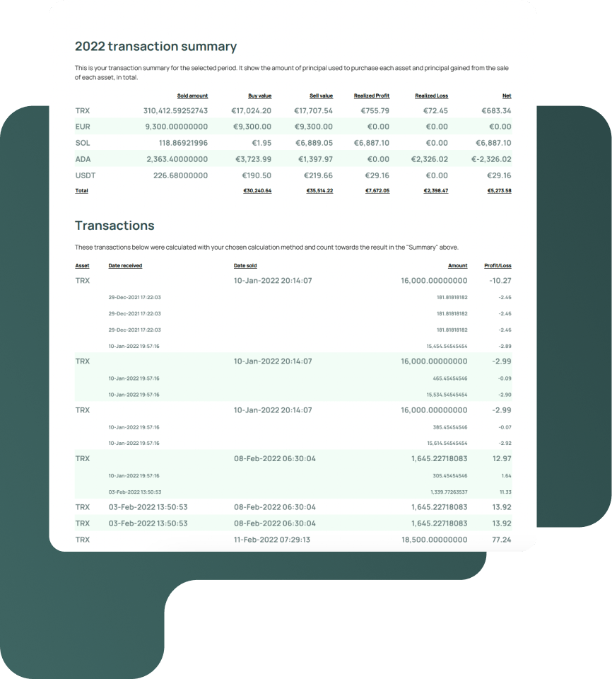 Get instant insights into your crypto portfolio by importing your data. Whether through our automated API connections or a simple CSV upload, you’ll receive a detailed breakdown of all your activities – from trades to earned interest.